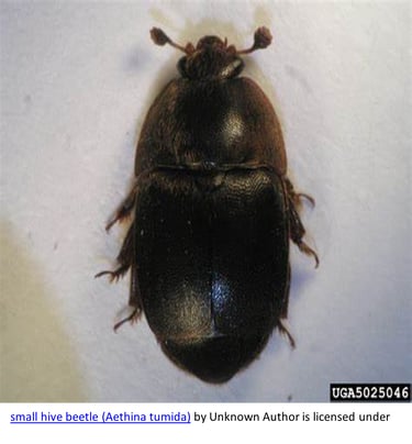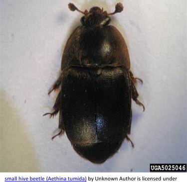 Hive beetles are small, dark brown or black beetles that belong to the family Nitidulidae. They are native to sub-Saharan Africa, but have spread to other regions, such as North America, Europe, Australia, and Asia. Hive beetles feed on pollen, honey, wax, and bee brood (larvae and pupae). They can also carry diseases and fungi that can infect the bees and the honey.